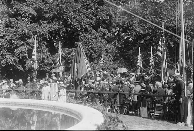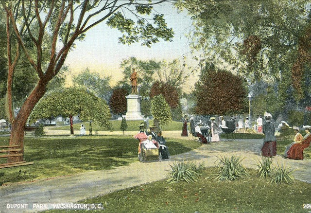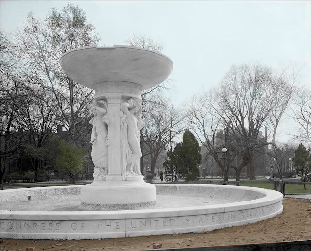 In 1881, then Secretary of State James G. Blaine, an early Dupont Circle resident, was complaining about the poor condition of Dupont Circle park (known then as Pacific Circle) and was pushing to have it cleaned up. The park had fallen into generally bad condition, with its concrete walks needing to be replaced and the lawn to be re-sodded. The wooden fence around the park needed replacing, and the open area was in need of trees and flowers. Blaine also thought that the circle could benefit from a fountain or statue of some sort. He actually suggested moving the Bartholdi fountain from the Capitol grounds to the circle, claiming it had attracted a lot of attention at the Centennial Exposition in Philadelphia but hardly any since its arrival in Washington. But the assassination of President Garfield distracted Blaine from his improvement project for the circle.