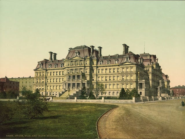 In 1864, Under Secretary of War Edwin Stanton’s direction, two floors were added to the Old War and Navy buildings to meet the expanding space requirements created by the Civil War. The White House’s telegraph office, which Lincoln often referred to as his “office,” was located on the second floor of the War building. Lincoln would spend endless hours there and sometimes the entire night following activities on the battlefields. By the end of the war, the War department had spread to over 11 buildings.