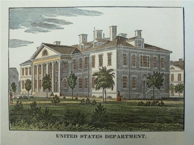 In the spring of 1801, the State Department was complete and on May 2, 1801 staff began the move from temporary offices in the Six Buildings (located on the north side of Pennsylvania Avenue between Twenty-first and Twenty-second Streets Northwest) to the newly completed building that it also shared with the War and Navy Departments.
