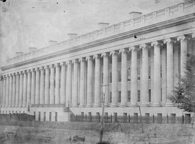 The construction of new Treasury building was finally authorized by Congress in 1836. After construction had begun, the building met with such heavy opposition that a congressional bill in 1838 calling for its demolition was narrowly defeated by a vote of 94-91. By 1839, the east and center wings of the Treasury following were finished, boasting an impressive colonnade of 30, three-story columns running the length of the east wing along 15th Street. These originally sandstone columns were replaced in 1908 with solid granite columns to match those on the porticos of the north and south extensions. After the Capitol and the White House, the east wing of the Treasury building is the third oldest federally occupied building in Washington DC.