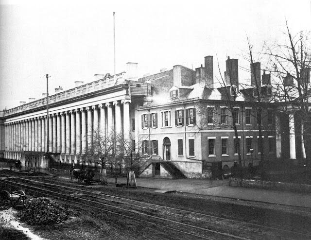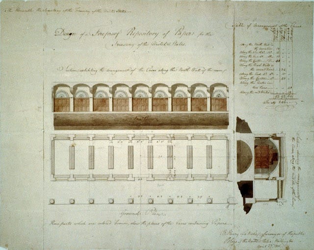 By 1805, the records were beginning fill the Treasury building. In 1806, architect Benjamin Latrobe was hired to design a fireproof extension for the Treasury Building.