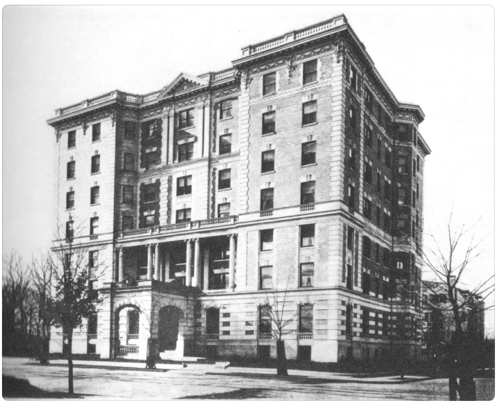 Woodward enlisted the architectural firm of Harding & Upman and, in 1909, started construction of a seven-story Mission Revival–style apartment house of brick and iron. When it was ready for occupancy in October 1910, it offered a total of forty-five rental apartments. Three apartments located over the building’s entrance were duplex units, with a dining room, kitchen, pantry, parlor and library on the first level and three bedrooms and a bath on the second. The building originally offered many amenities including a roof garden, a summer pavilion and a doctor’s office on the ground floor. The basement contained a party room, a billiard room and a barbershop. In 1973, the Woodward would be converted into a condominium.