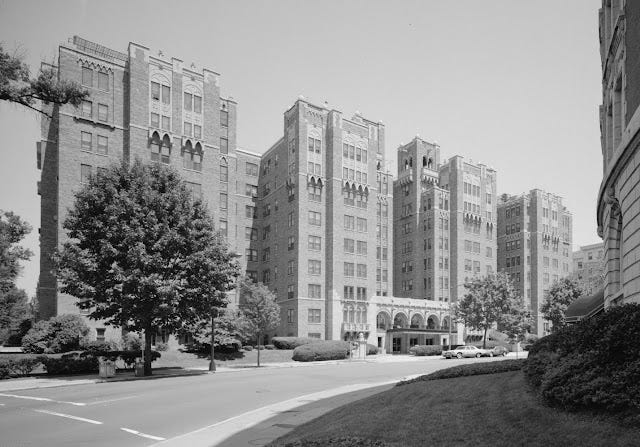 In 1910, Woodward undertook what would be his final building project, the Airy View, located at 2415 Twentieth Street, NW. The building remains unique in Kalorama Triangle, as it is the only one with a central bay pushed back from the street to create an enclosed courtyard, a popular configuration of Washington apartment buildings at this time.