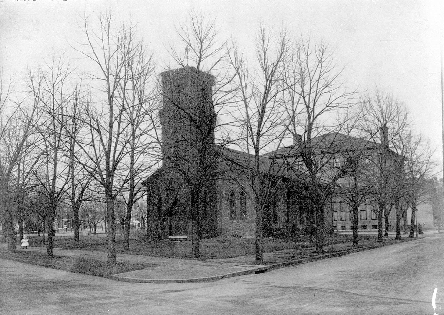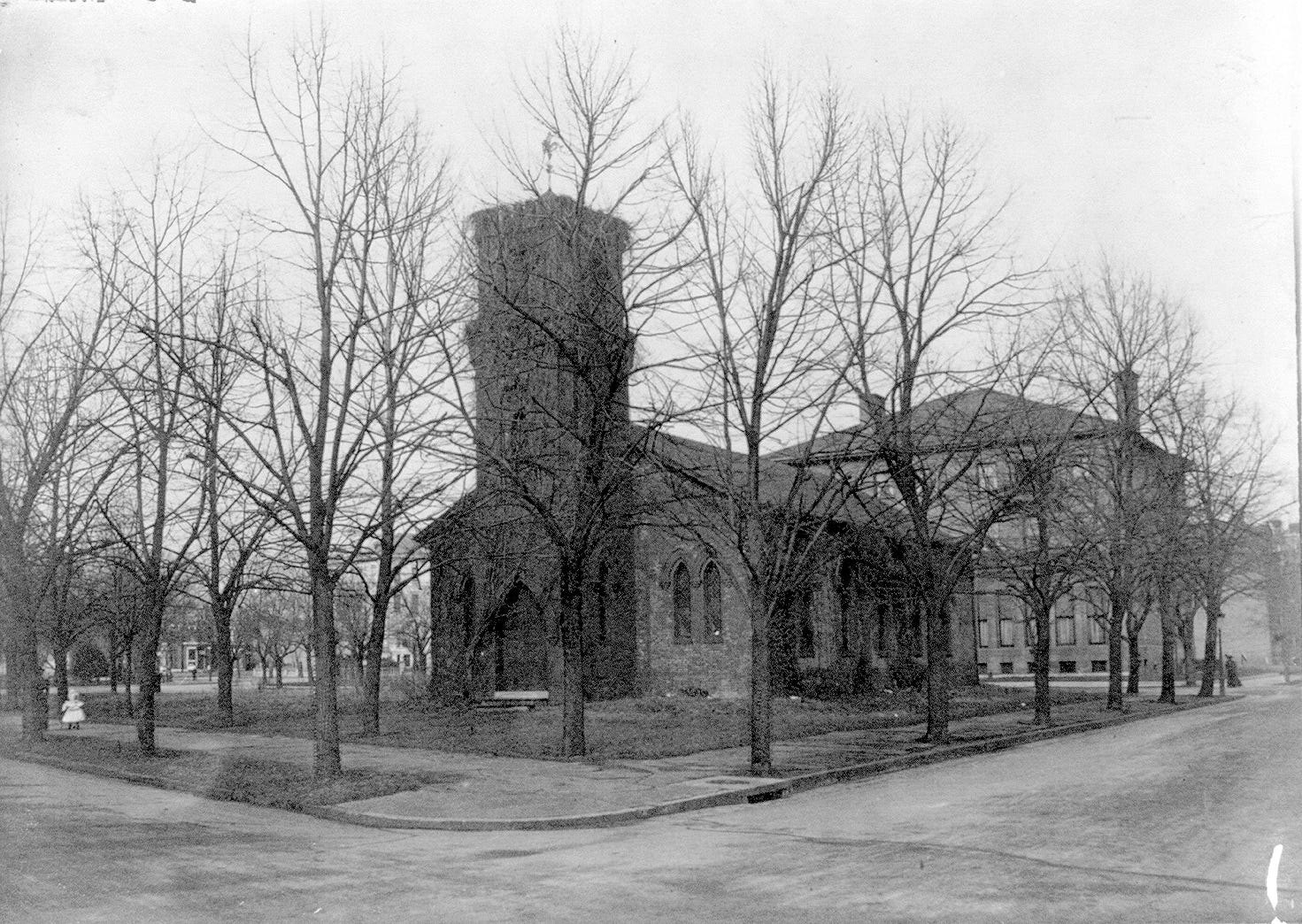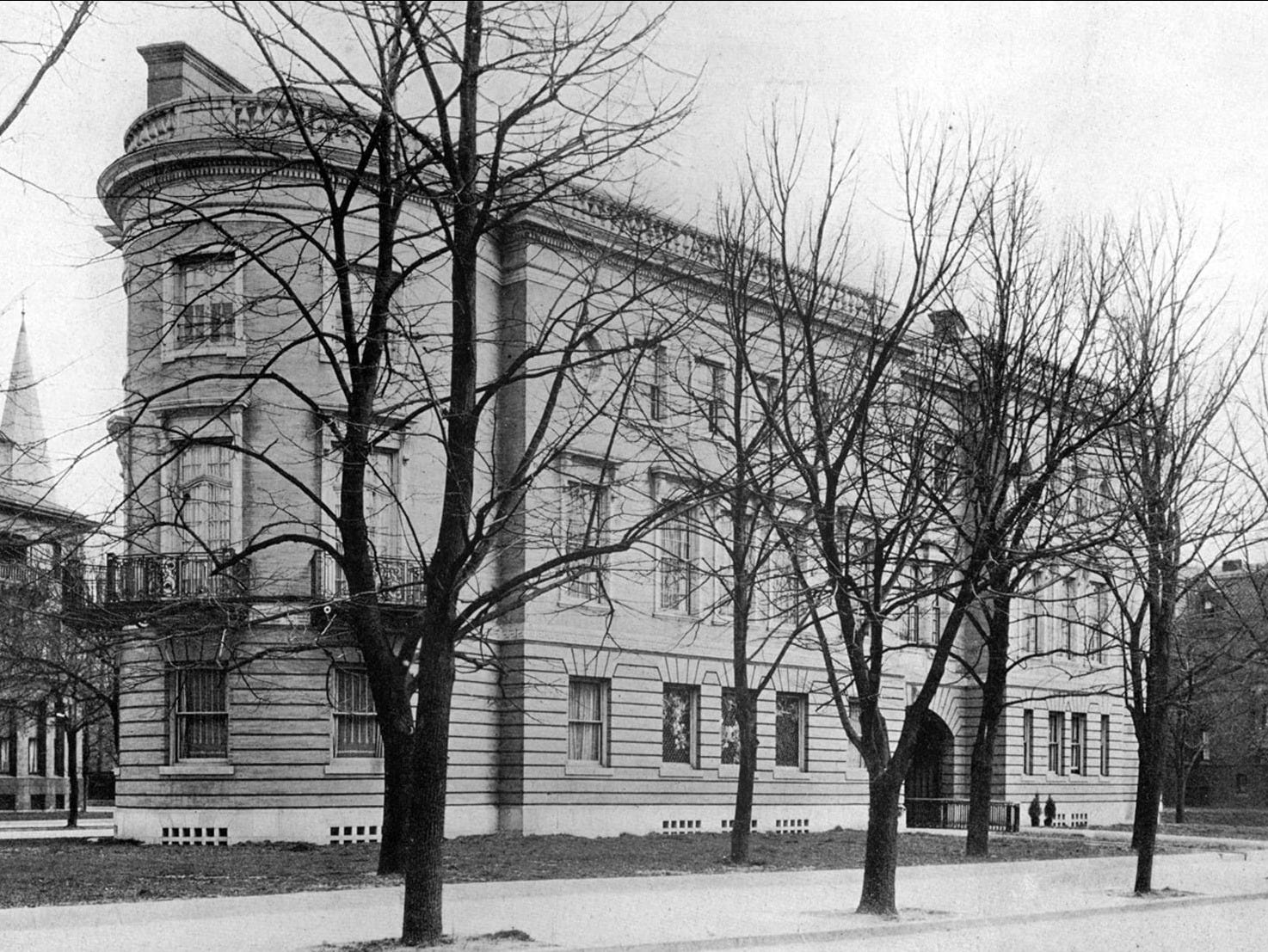 By the time they started looking for real estate in Dupont Circle, there were only two lots available directly on the circle itself— the most prestigious location in the neighborhood—that were large enough to accommodate the size of mansion they wanted to build. One was the site of Stewart’s Castle that was due to be demolished. The other was the abandoned Holy Cross Episcopal Church that had stood on a pie-shaped lot between Massachusetts Avenue and P Street NW for 25 years. In 1896, Charles Van Wyck’s widow, Kate, sold the lot, along with its deconsecrated church, to the Wadsworths.