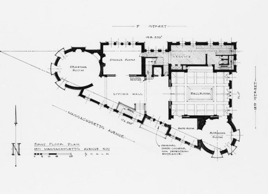 Construction of the 3-1/2 story yellow brick house at 1801 Massachusetts Avenue began in 1900 and by the time it was completed in 1902, the final cost exceeded $85,000 (over $3.2 million in 2025). The pie slice–shaped house was designed specifically for entertaining. Two floors were entirely devoted to drawing rooms, one opening into the next, ending at a dramatic two-story ballroom with a musicians gallery.